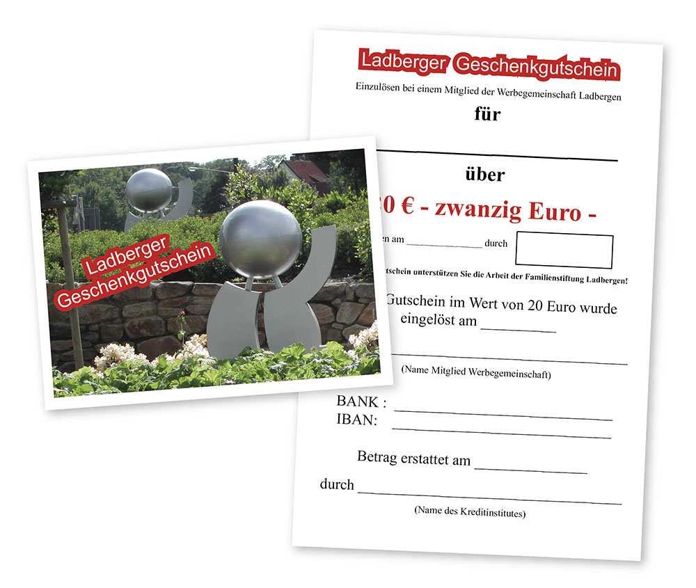Der 2019 eingeführte neue Ladberger Geschenkgutschein löst die bisherige Variante ab sofort ab. Aus verschiedenen Gründen mussten wir vor allem bei der Verwaltung und der Erstattung der Gutscheine neue Wege gehen. Die alten Gutscheine können noch bis zum 31.12.2019 bei den Unternehmen eingelöst werden.